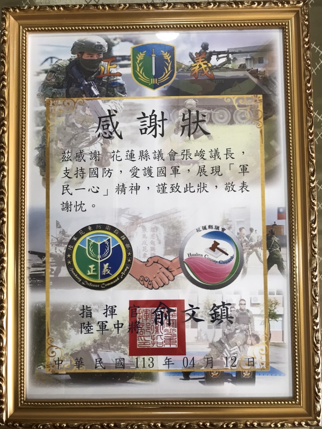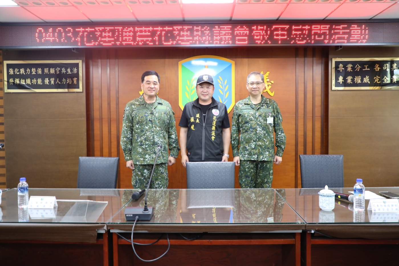 花蓮縣議會議長張峻4/12日上午在花蓮縣軍人服務站站長黃鍾昌等人的陪同下,前往陸軍花東防衛指揮部慰勉國軍,除了致送500包麻糬,並致贈10萬元慰問金,對國軍弟兄官兵表達最大的肯定和慰勉之意,花東防衛指揮部俞文鎮指揮官深表感謝。